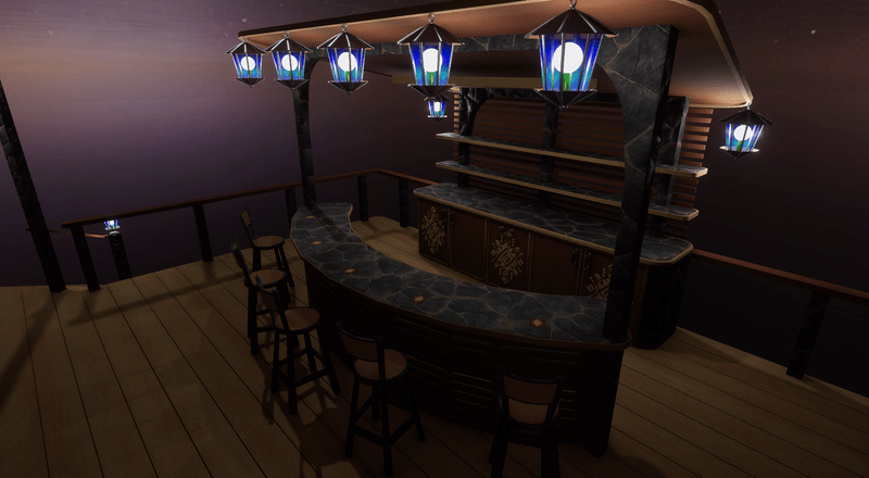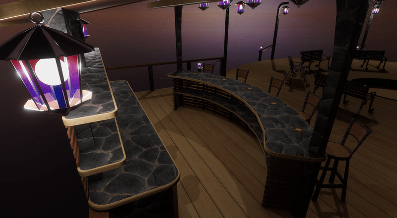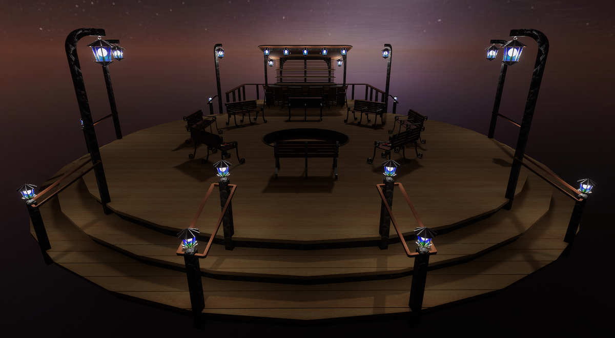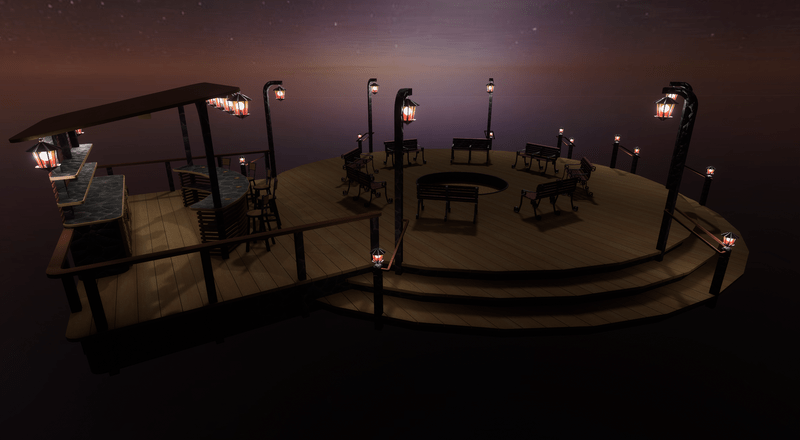 Thank you for considering this fantastic piece. This is a delight to add to any back yard or open space. it currently furnished with a bar, benches, stools, lights, fire pit and sit points. just place any beverage on the bar and build a fire and your gonna be off to a GREAT evening with your friends. You can edit the materials to your liking or just leave it as beautiful as it is.