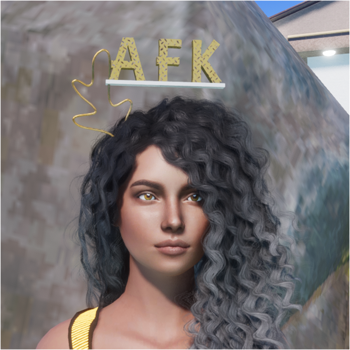 Golden AFK Diadem. Just see all my items in my experience: https://atlas.sansar.com/experiences/acpixl/acpixl-animation-avatar-store