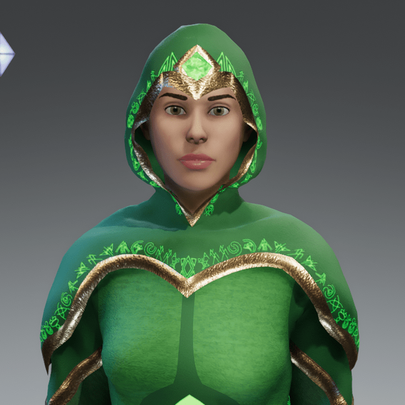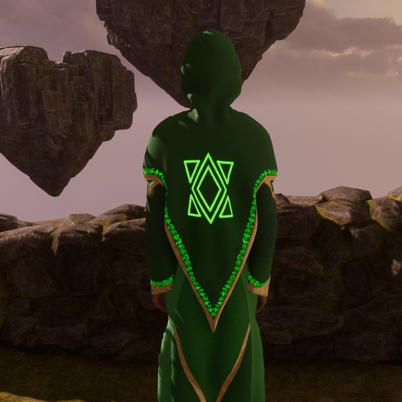 Rich Emerald coloured robes with golden trims, two large glowing Emerald gems set in the hood and belt. To top it all off, patiently crafted original runic alphabet lining the hood and sleeves that is luminous and animated with a pulse that fades in and out of visibility. The enchanted gemstones also glow in the same manner as the runes. Fitted to the default female avatar 2.0. A very magical garment perfect for any aspiring wizard or mage, can be used for role-play or just as a fancy outfit for a party.