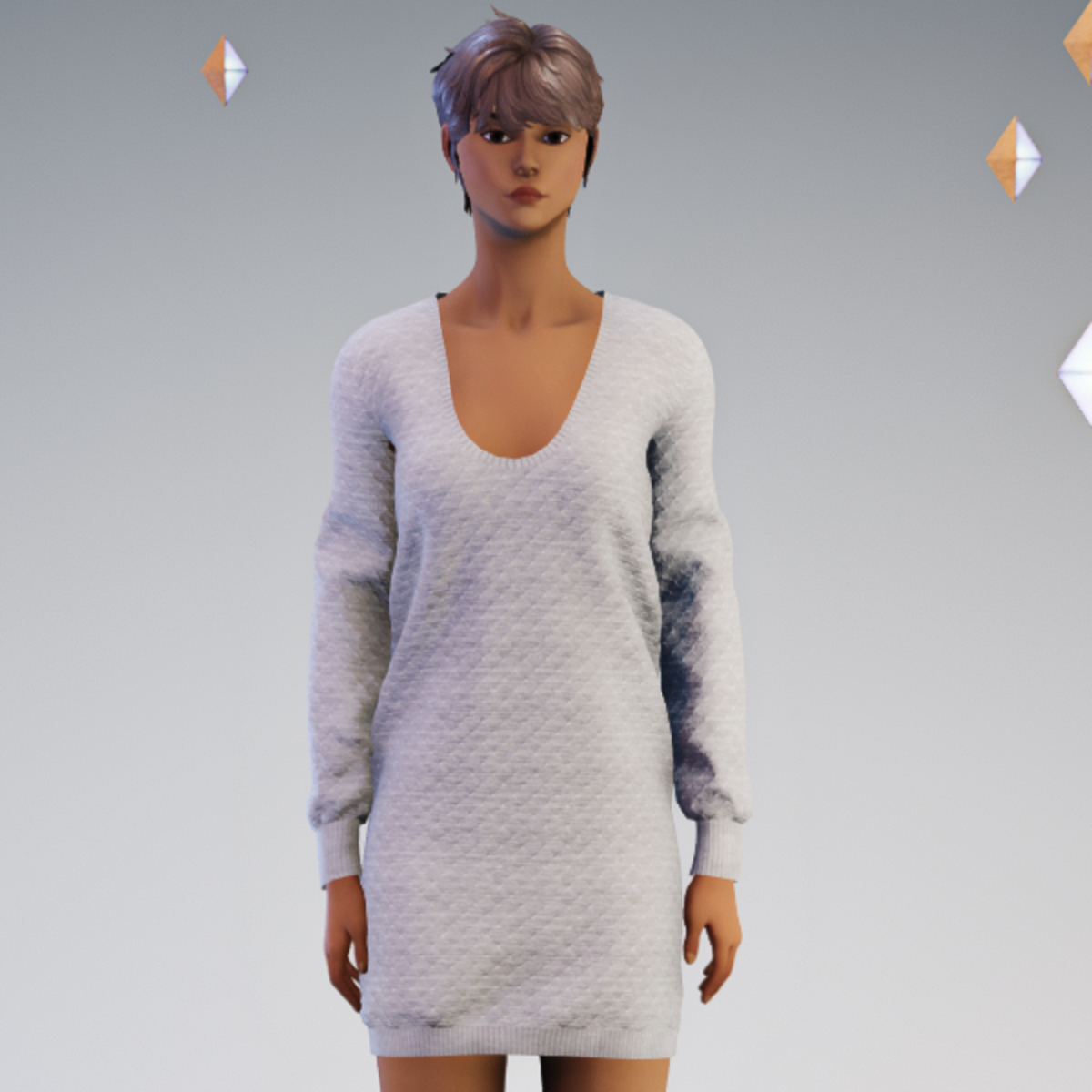 Quilted sweater dress has low scooped neck and full sleeves with ribbing. Materials enhanced. Please try demo.