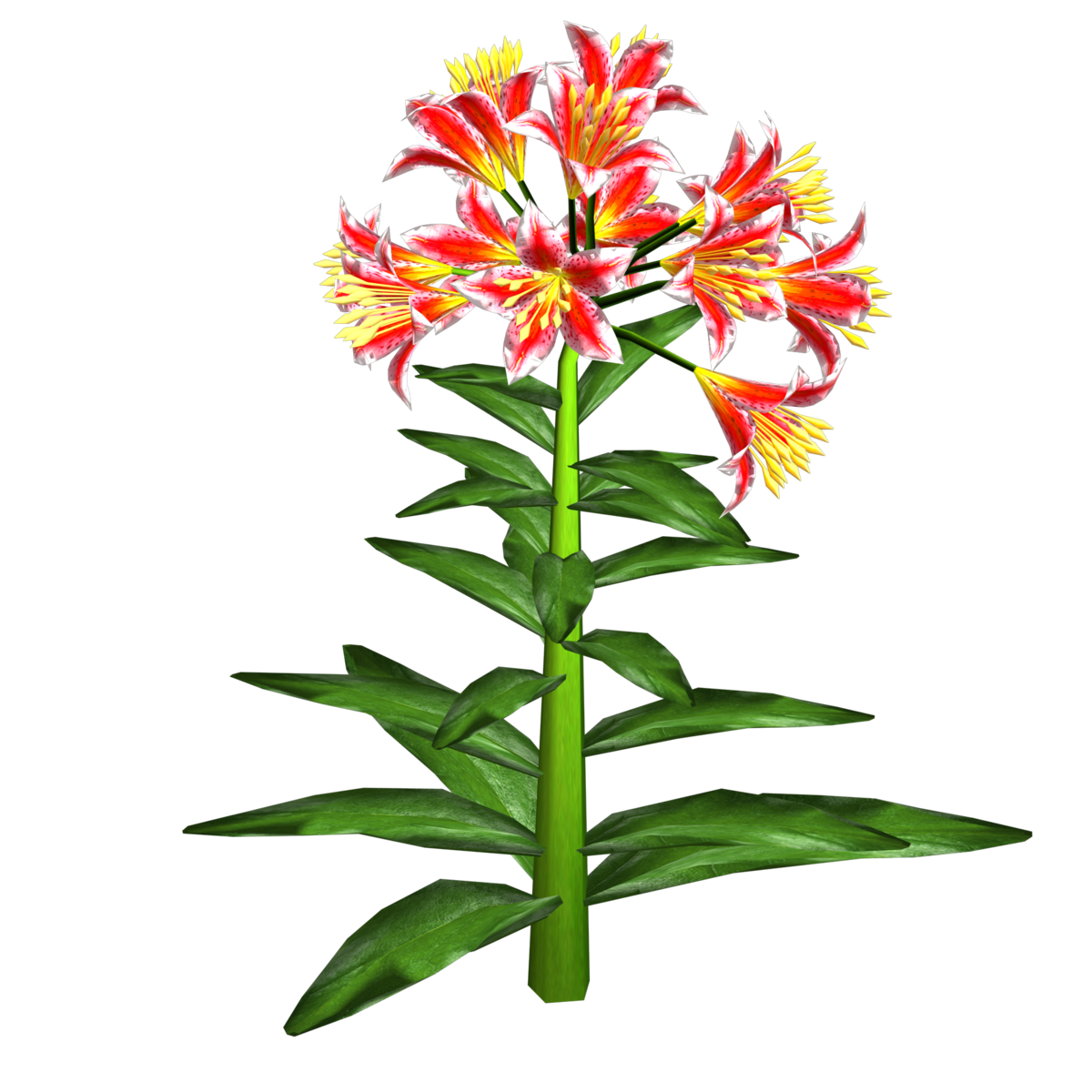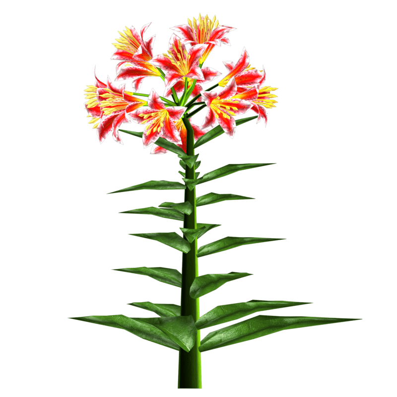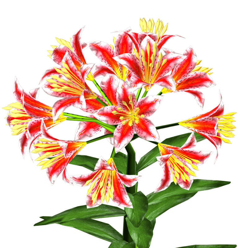 1 Trumpet Lily Plant with about 14 blooming lily flowers and several leaves for your lovely gardens. Polygon count: 15480. There is no collision on this mesh so you can walk through it. I have many colors. To see this flower in Atlas, please visit "LovedWarrior's Ground Plants: https://atlas.sansar.com/experiences/lovedwarrior/lovedwarrior-s-ground-plants" Please note that all my flowers are 100% detailed mesh. Each petal, pollen, stalk and leaf is made by hand and placed by hand. All the textures are also made by me. If you have any flower or plant requests, show me a picture of the flower and I will let you know if I can make it for you. Enjoy!