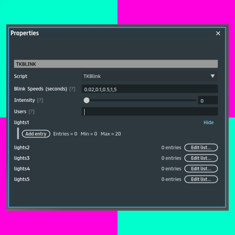 ~ TKBlink (Made for T4ZZ-2788) ~ Used to Prepare Interactive Blinking lights ~ Works using both chat commands / simple scripts ~ Drop the script on an Object that contains lights or simply add lights to the Lists provided in the script ATTENTION: Dont forget you need the light's Scriptable option set to ON, else scripts cant manipulate them. COMMANDS: /tb1, /tb2, /tb3,....as many as your speeds count [activates blinking lights with these speeds] /tbflicker [makes lights flicker randomly] /tbon to turn the lights on /tboff to turn the lights off /tbstop [stops the effect] /tbopen, /tbclose [changes access restrictions] (you can use all these commands without "/" to use as your event name in your simple scripts. for example: tboff to stop the blinking.)