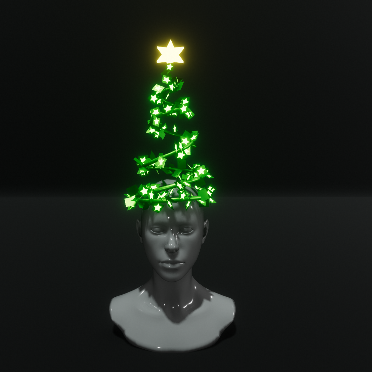 A spiral Christmas tree hat for the female avatar, with a bright star on top and little stars lighting effect, in green color.