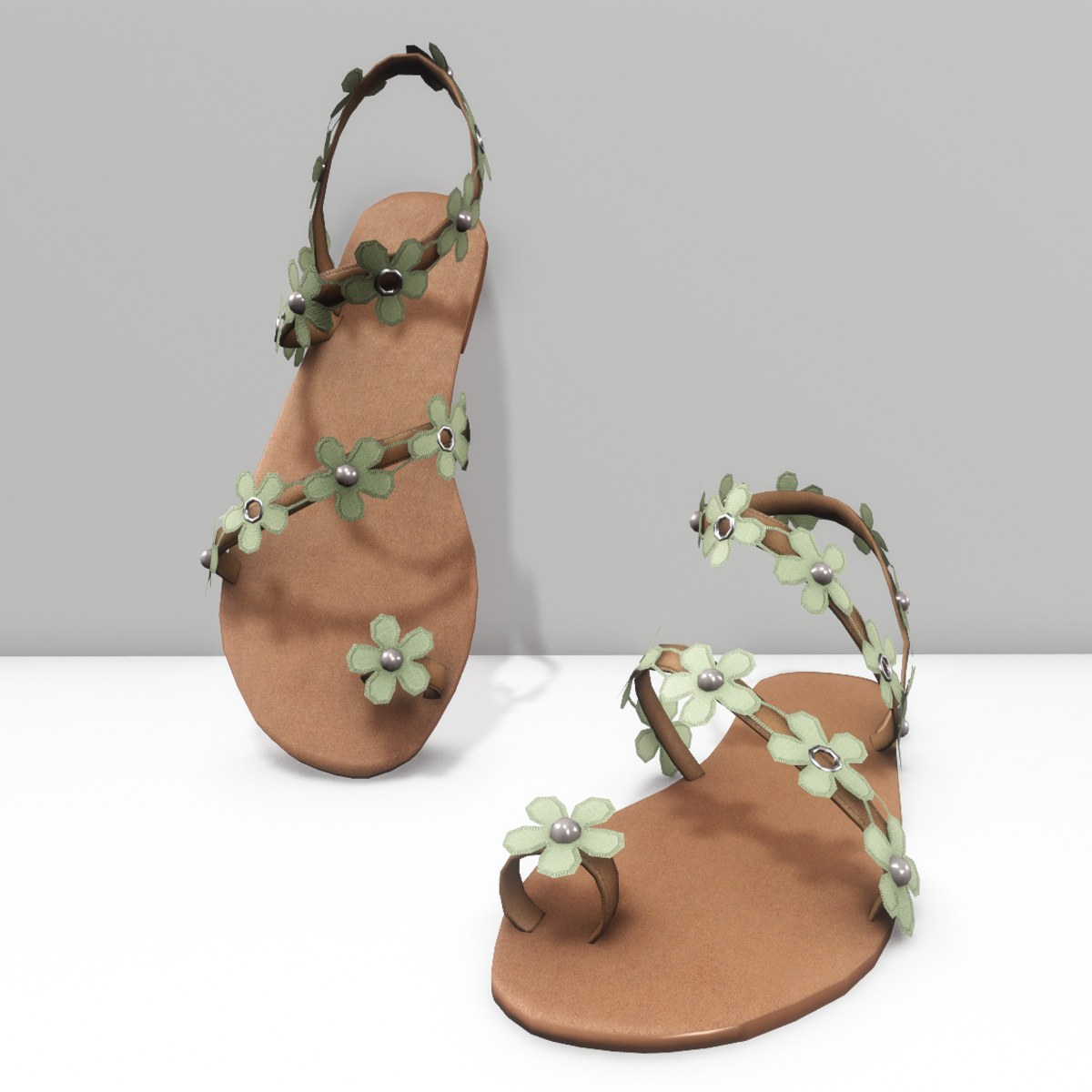 A beautiful, romantic pair of ring toe sandals, decorated with embroidery flowers with metallic details. Strappy, made with light brown leather, ideal for spring and summer, even as wedding shoes. In pastel green colour. Get the free demo before purchasing here: https://store.sansar.com/listings/cadfdcea-4da0-4029-8e23-9480d006ca5b/ring-toe-sandals---demo