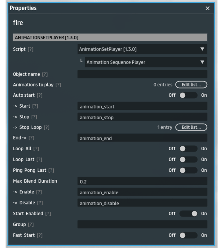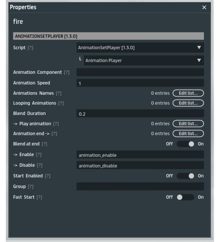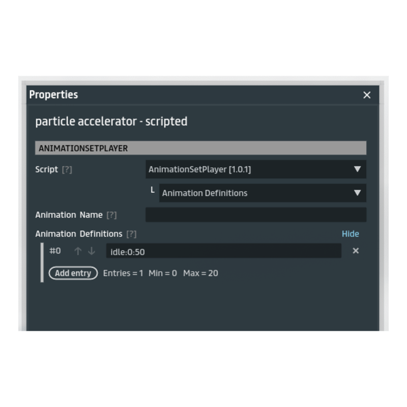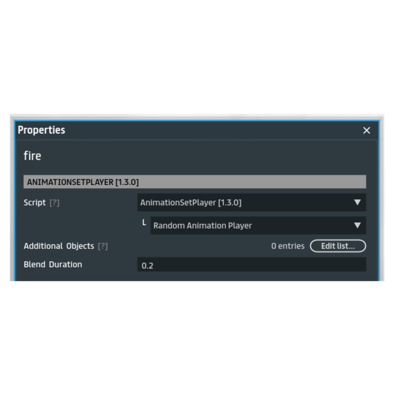 Animation Set Player is a set of scripts that allow you to play multiple named animations in the fbx with one script. It is also possible to play a sequence of animations, either named from frame subsections. The script is able to calculate the duration of an animation from the frame count, and therefore can trigger an event when the animation ends. Also included is a basic random animation loop player that plays all the named animations in the objects at random in a loop. This allows to play multi-step animations that end in a loop with one script, such having a draw gun animation and then going into shooting loop. It can be used on npcs to allow for smooth (start walk -> walking -> stopping -> idle -> etc) animations. Changelog: 1.0.0 - initial release 1.1.0 - added 'Animation Auto Definitions', if you have multiple animations defined as separate animations in the fbx, it can now detect them automatically. 1.1.1 - Some bug fixes. Added 'Print Definitions' to Animation Auto Definitions script that will print in the debug console all the animations it finds in the object. 1.2.0 - Added random animation player 1.3.0 - Added a simpler multi-animation player * I allow buyers to resell this script as part of their own products, but not as a standalone script