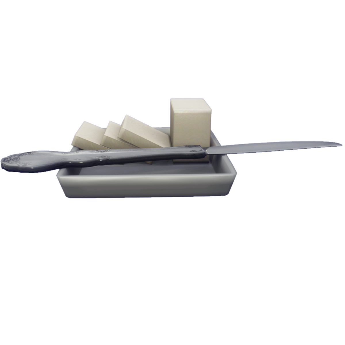 Slices of butter on a small dish with a butter knife. It can be see here: https://atlas.sansar.com/experiences/stupidmonkey/abby-s-monkey-s-things