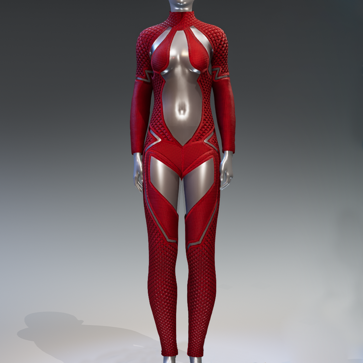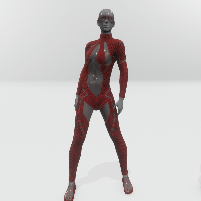Futuristic female jumpsuit, with large, plastic like, high transparent areas. It has long sleeves and mock turtleneck. Red color. Get the free demo item to check fit and style before purchasing here: https://store.sansar.com/listings/89a0defa-80b5-4282-a3d5-f5d807904673/baryt-jumpsuit---demo