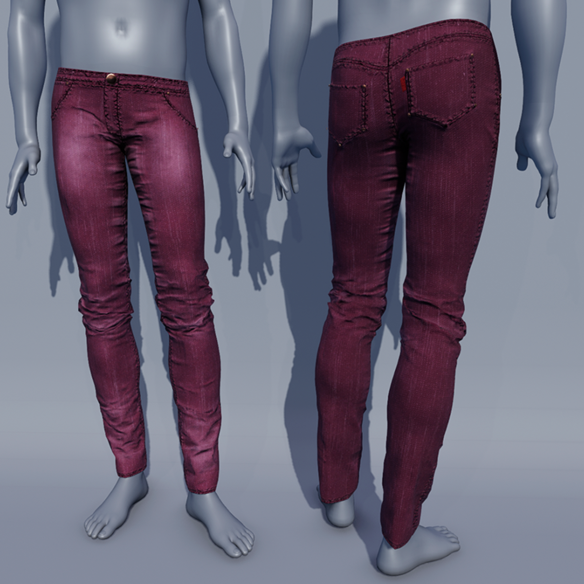 This is a jeans pants for men. As I made it with Marvelous Designer, you can adjust it to your avatar. It is available in 10 different colors. It will perfect fit on default men avatars. In order to easily fit it on custom avatar, before adjusting you might use Transform. Then you can adjust it and may be stretch a bit the fabric.
