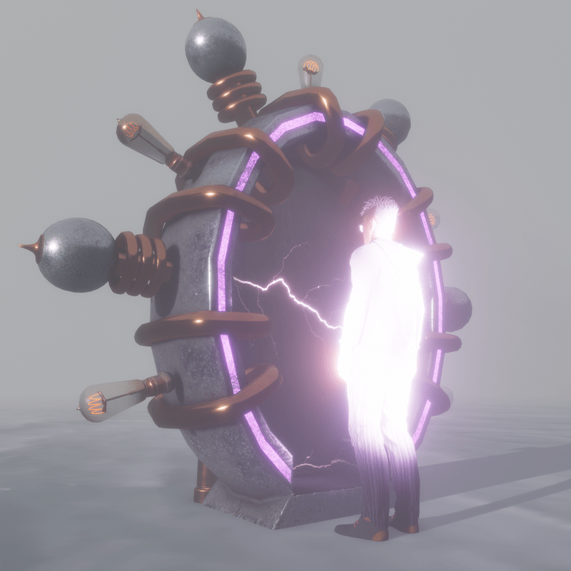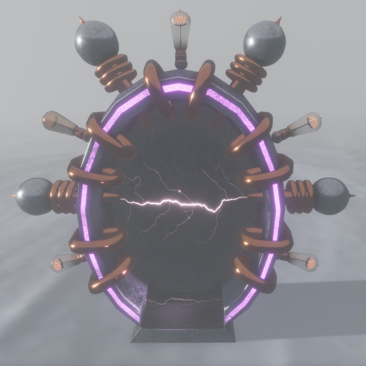 Deco style TP-portal for personal transportation to other experiences or locations within experiences. Buy electric sound effect separately. To illuminate lightning, set up spot lights (see photo). There are various emmissive settings that one can adjust. The settings here are: Front Ring = 23; Red Light = 1.4; Green Light = 20; Element = 27 If you need assistance with this product, please contact RAG (rag@ragmedia.com)
