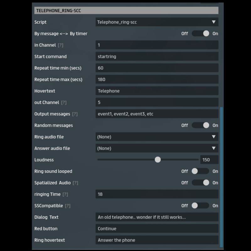 This script permits to simulate a telephone ring(it rings by random timer you set, or by a command). A visitor can decide if answer or not. If answer(by clicking it),the script will generate one or more output commands, that can trigger events like movements, sounds and more. When telephone is not ringing, you can decide to set a dialog popup. In the pictures, you can see parameters to set. It's compatible with simple scripts. I used it in my experience here: https://atlas.sansar.com/experiences/sergiodelacruz/orphanage-of-angels [FIND MY OTHER SCRIPT SEARCHING BY TAG "easyscript"] ★ If you like this item, please support me giving a rate! www.sergiodelacruz.net