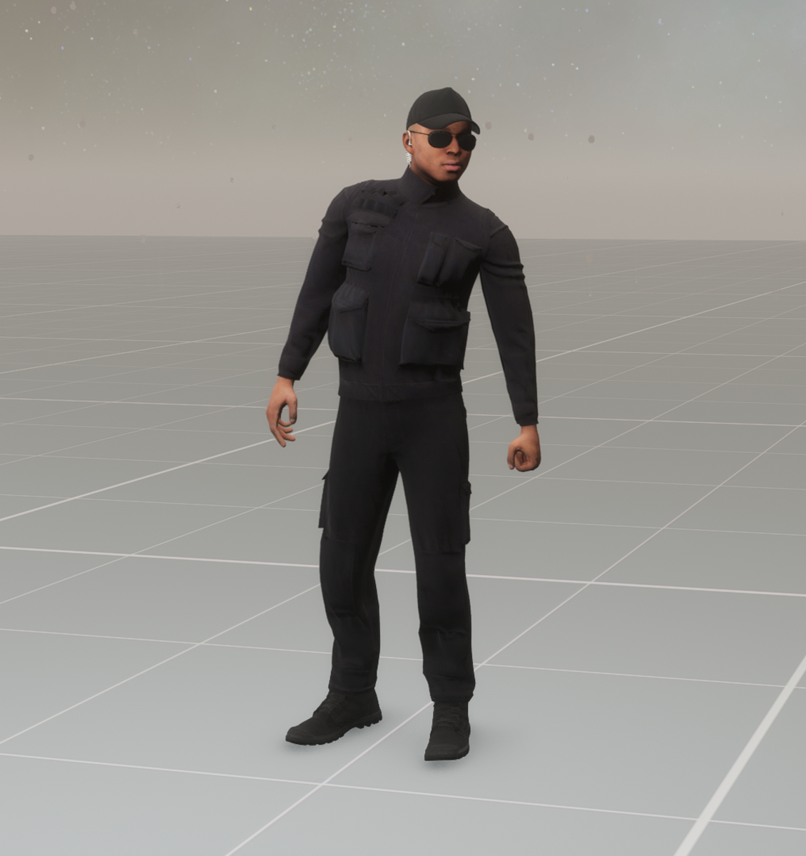 NPC security guard. Standing and guarding. I resized the textures and modified the shader. Used in the Linwood world. See it 'in person' at Lando's Mini Mall https://atlas.sansar.com/experiences/lando/lando-s-freebies