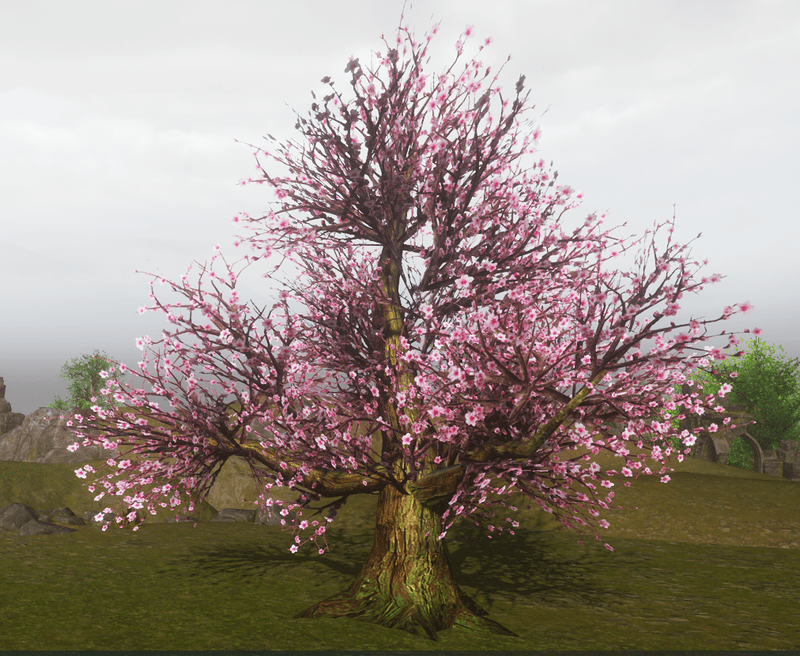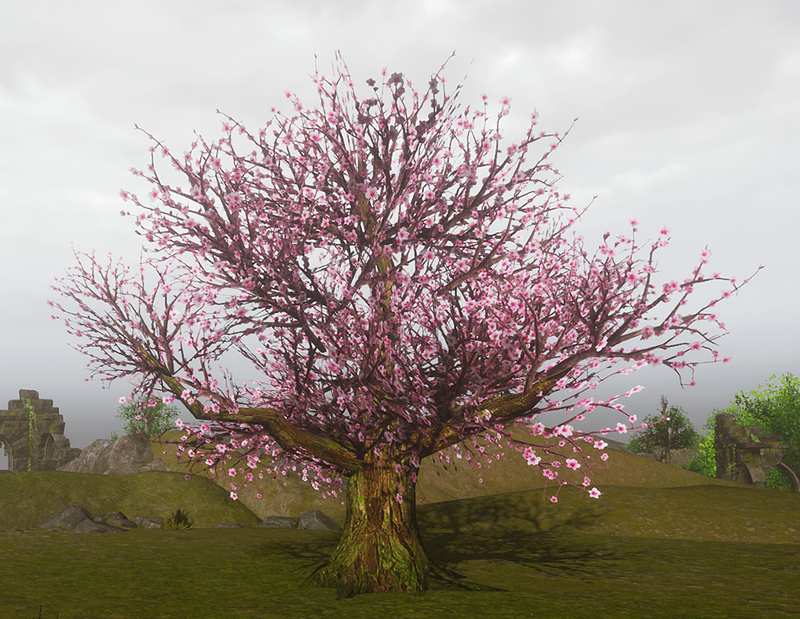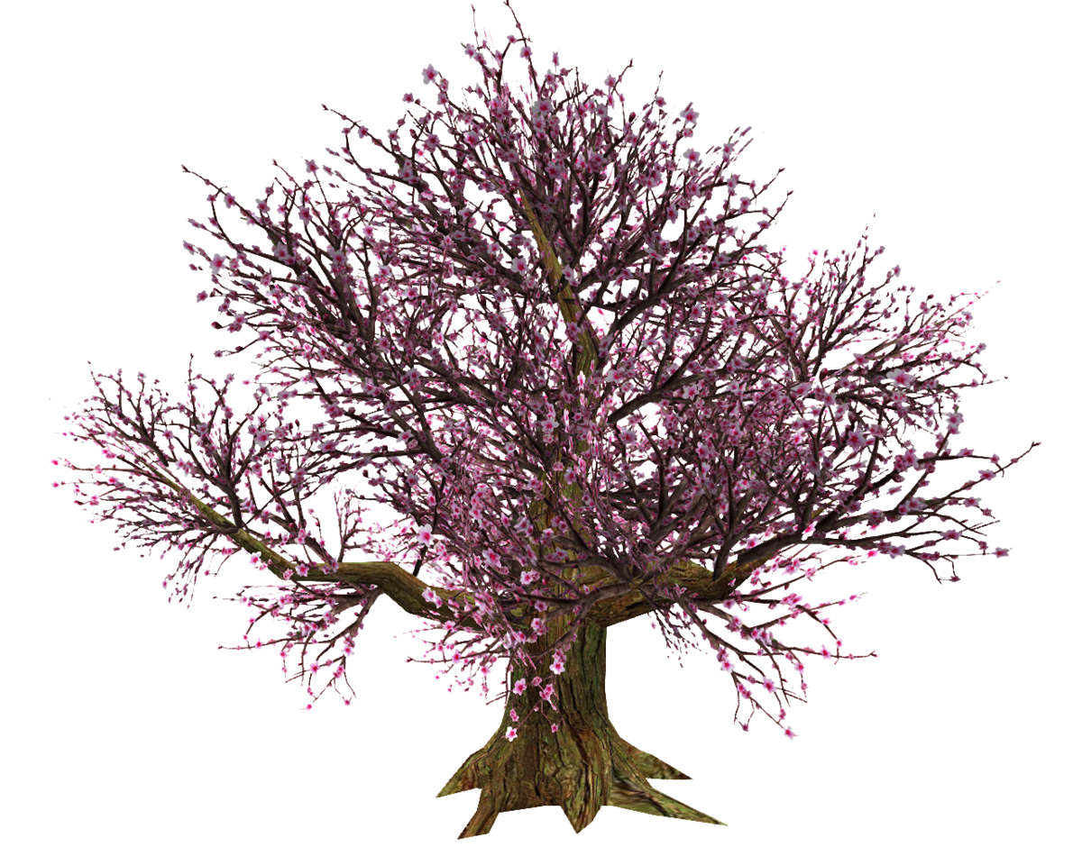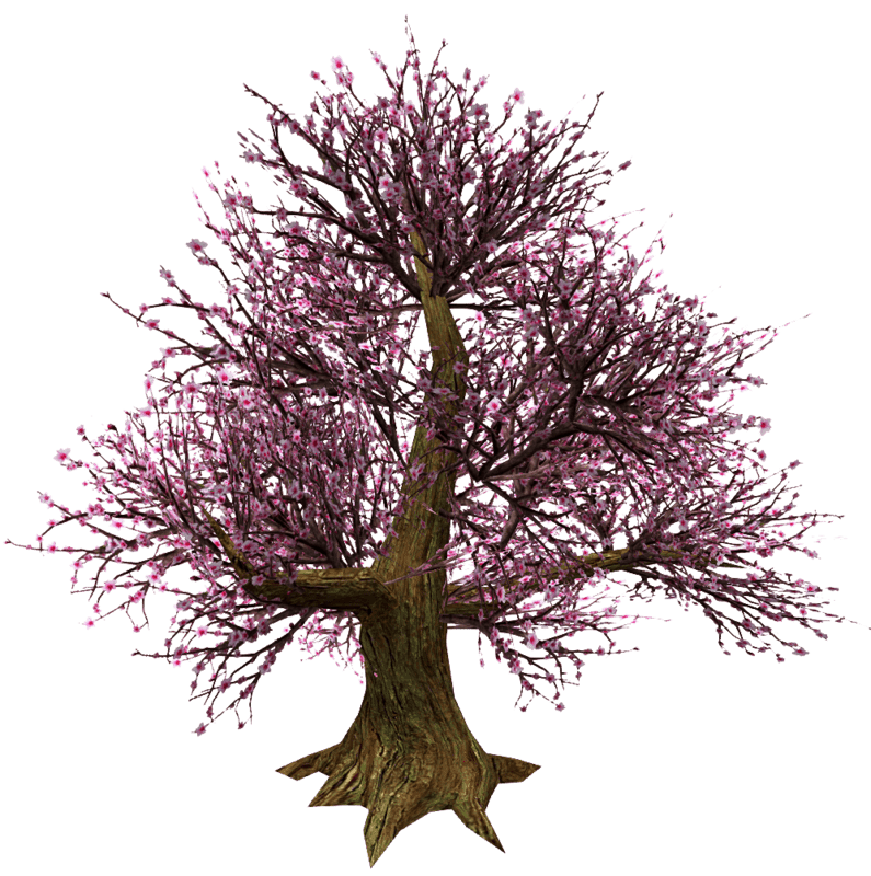 A large wide pink tree. Trunk is solid mesh. Leaves and branches are images on flat planes. 749 triangles. See in Sansar experience - https://atlas.sansar.com/experiences/reidparkin/reid-s-plants