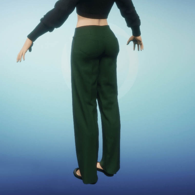 Women's dress slacks with front closure, welt pockets and back patch pockets. Front and back center legs have gently pressed folds for a dressy appearance. Be sure to animate cloth when wearing these slacks. Also, when layering, wear top layers first and then add lower layers. So if wanting to tuck in a shirt, where the shirt first then the slacks. If wanting to wear a top over the slacks wear the top first.