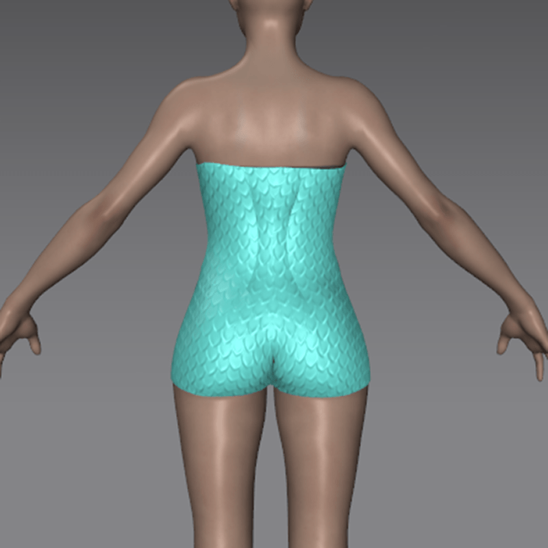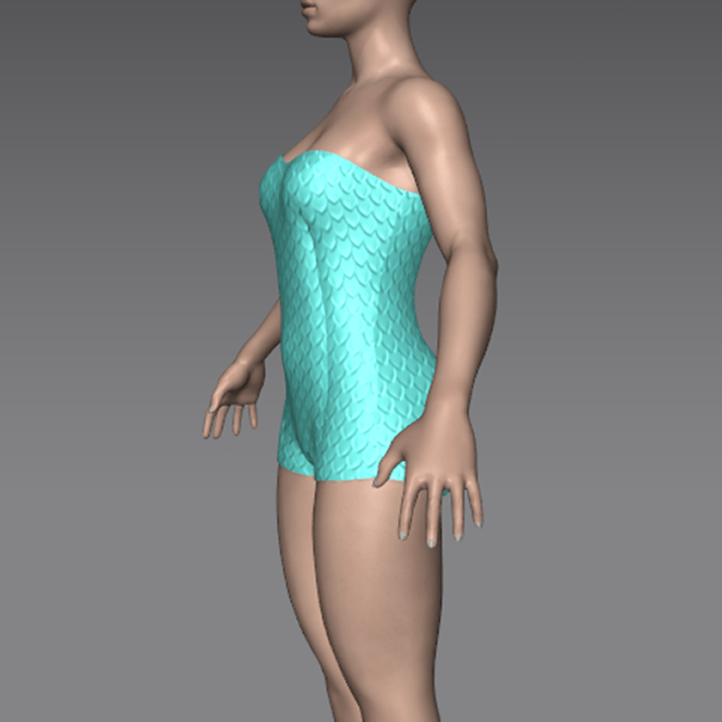 A simple one-piece women's swimming costume, in a rubberized, clingy fabric. 1950's-styled. Nostalgic fish-scale ribbed pattern. In aqua. Modest and covering.
