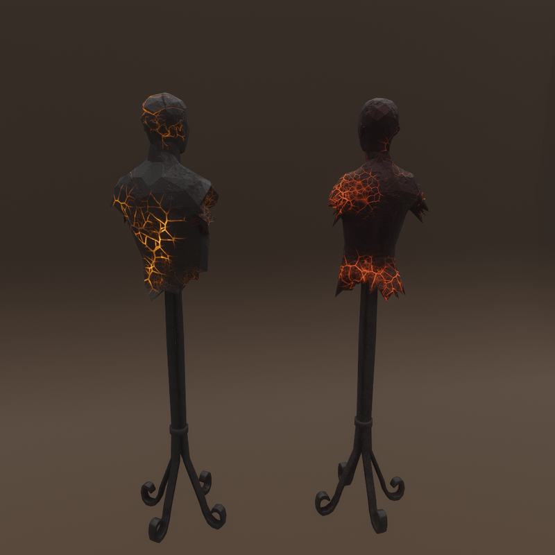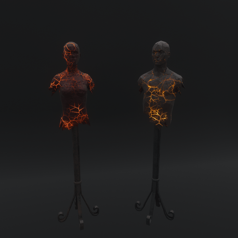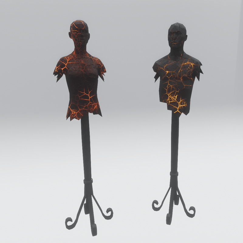 2 Mannequins made of lava rock with a hammered metal stand, both have glowing lava cracks with scrolling textures. example gif: https://gyazo.com/b30d3de49c7501db705d82900a56f249 they are made using the default avatar REF files I believe they can be used to show clothing items as no proportions were changed feedback on this would be appreciated 3 people have confirmed this is the case and has worked well the pole is a seperate object (included) and can be removed or moved around Original ref files - Sansar Mesh and textures - TheNick