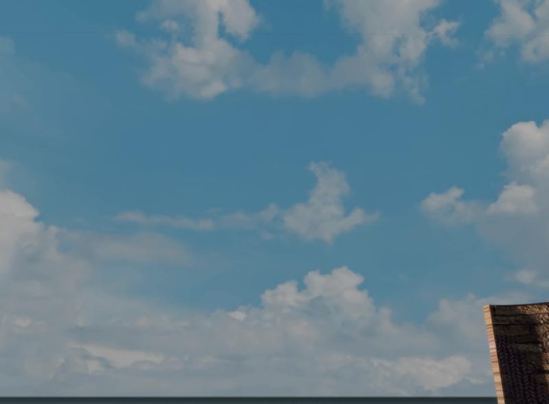 Enormous, puffy, snow-white cumulus clouds float high in a bright blue sky... on a July mid-day in Central Texas. No sun visible, but three evergreen trees poke their heads above the horizon. This sky will bestow feelings of cheer, brilliance, health and well-being to any of your Sansar Experiences, and will illuminate your scenes with a clean white light, with medium-blue shadows.