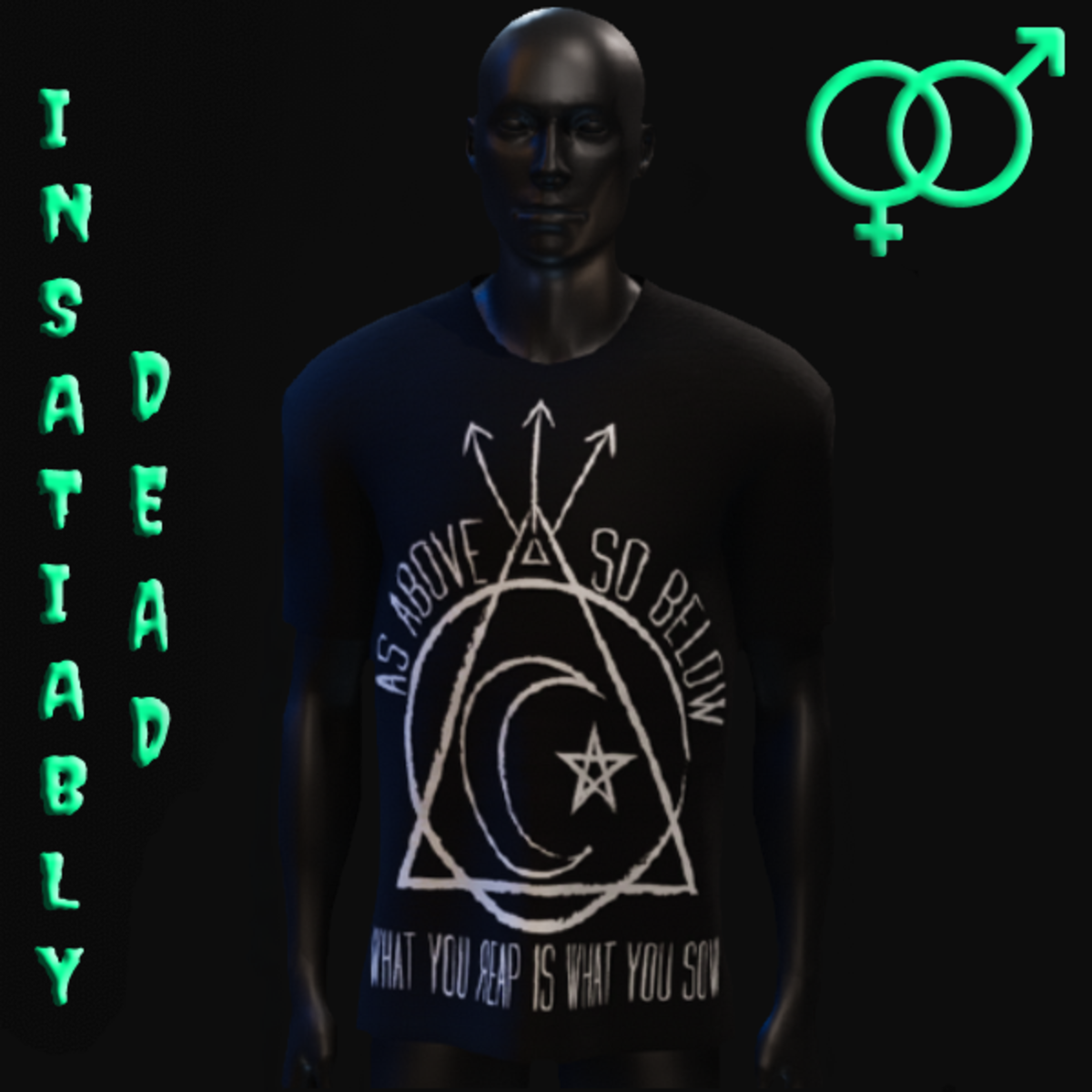 FOR ALL THE GHOULS AND GALS. UNISEX "AS ABOVE SO BELOW" T-SHIRT [BLACK/WHITE]. CREATED IN MARVELOUS DESIGNER WITH AVATAR 2.0. ADJUSTMENT MAY BE REQUIRED! FITTING INSTRUCTIONS CAN BE FOUND BY GOING TO THE LINK BELOW. https://help.sansar.com/hc/en-us/articles/115005693363-Fitting-Marvelous-Designer-clothing-to-your-avatar PLEASE RATE AFTER BUYING! IF ANY ISSUES OCCUR PLEASE CONTACT TEAGAN BROKKEN FOR ASSISTANCE. THANK YOU! <3 <3 GET INSATIABLY DEAD <3