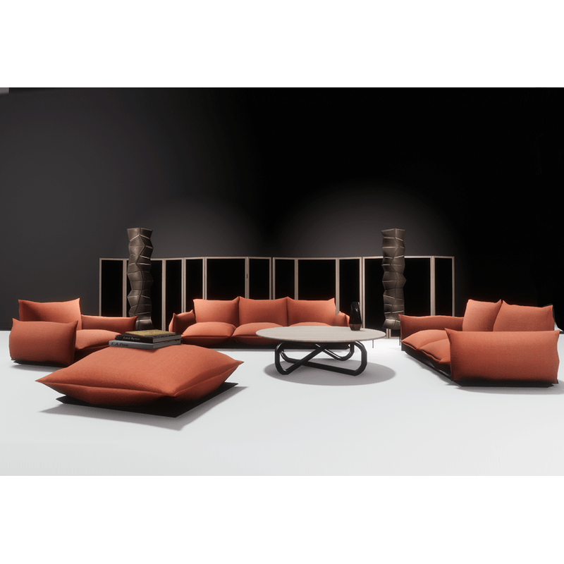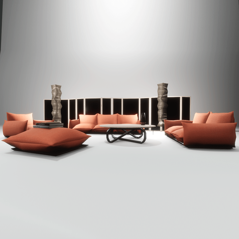 Set of furniture which includes: - Three-seater sofa - Two-seater sofa - Armchair - Ottoman - Round wooden table with metallic base - Floor paper lamp with point light - Wood and metallic decorative window screen - Poetry books - Marble and wood vase With collision (except books and vase) and editing permissions. You can take a closer look here: https://atlas.sansar.com/experiences/luise/studio-lamda