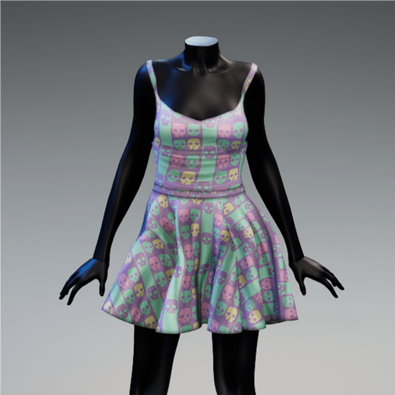 Tank dress in a pastel goth pattern. Created in Marvelous Designer with Avatar 2.0. Adjustment may be required!! PLEASE DON'T FORGET TO RATE AFTER YOU BUY! THANK YOU :)! https://help.sansar.com/hc/en-us/articles/115005693363-Fitting-Marvelous-Designer-clothing-to-your-avatar