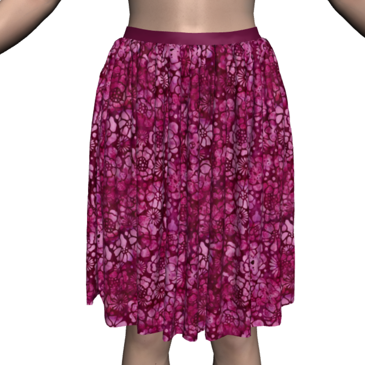 Dynamic knee-length skirt with pink batik floral fabric texture. Created in Marvelous Designer.