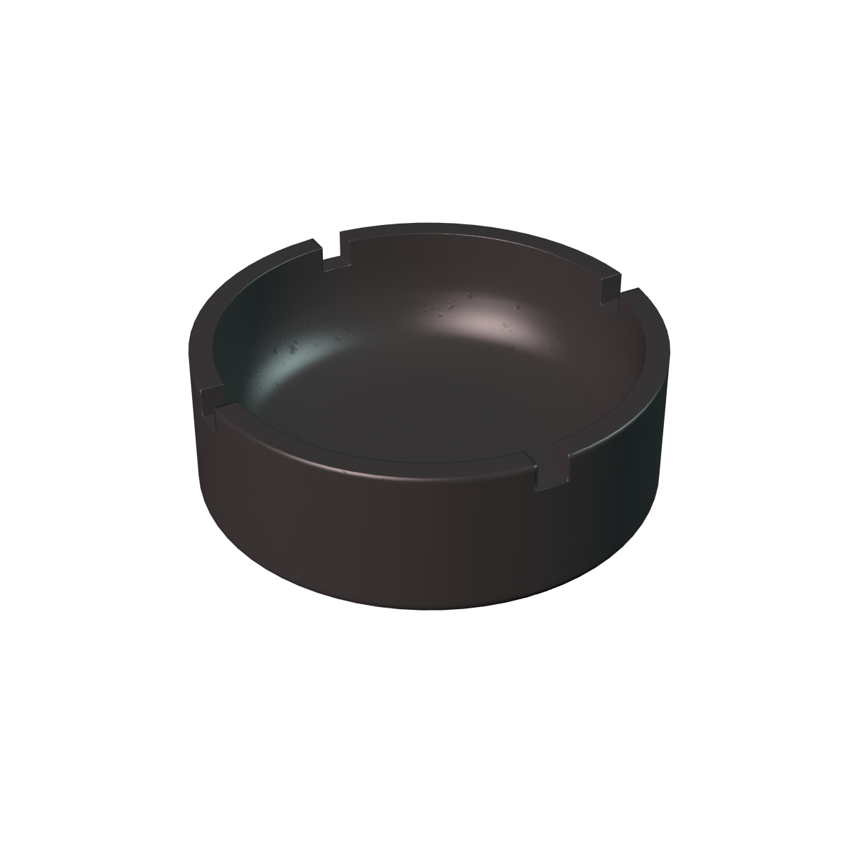 Ashtray made of dark high-gloss material / ceramic, diameter 15 cm with four notches. The surface shows irregularities by use.