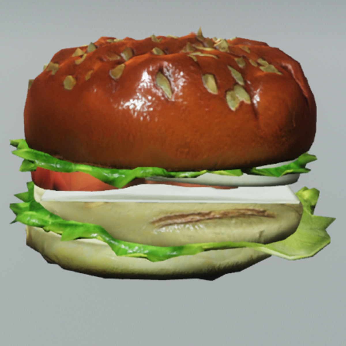 A sandwich with grilled chicken, with lettuces, tomato and Swiss cheese on a sesame seed bun. Sandwich is dynamic. Burger can be picked up with right or left hand. All components (exempting materials) can be modified.