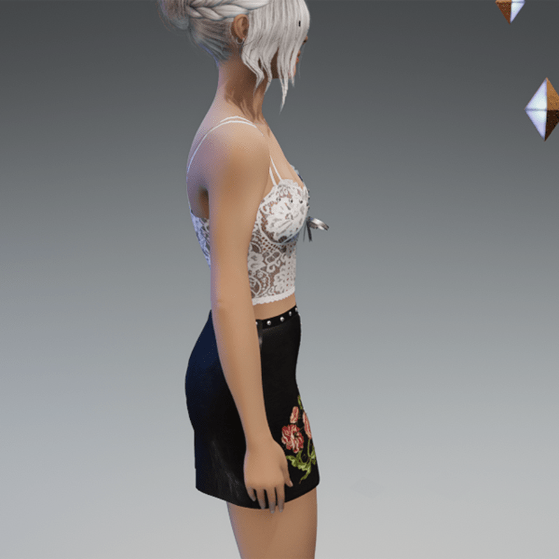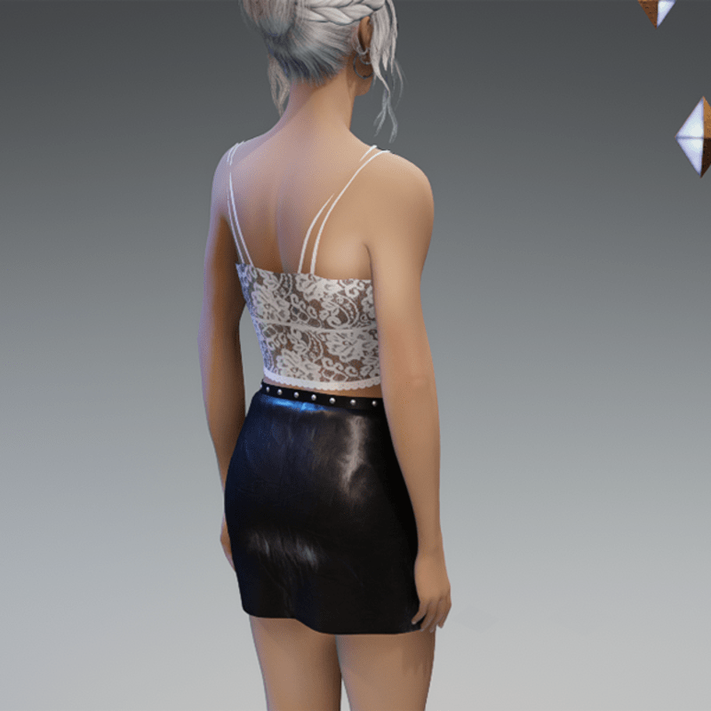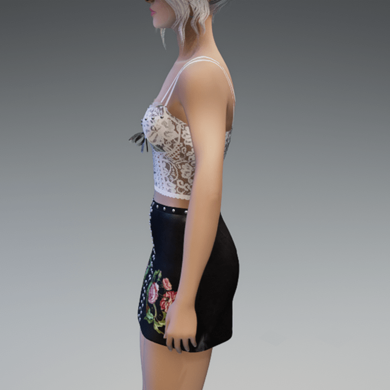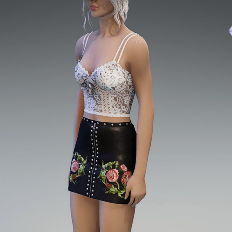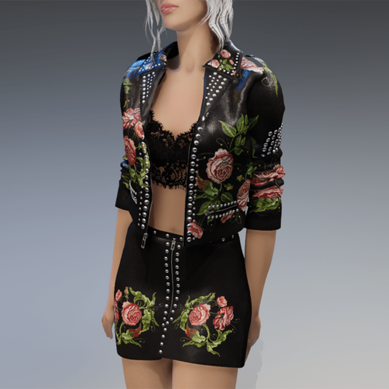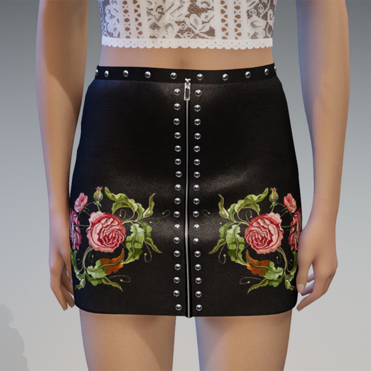 this leather skirt comes with the flower patches on the front as well as some rivets and a zipper. Enjoy! <3
