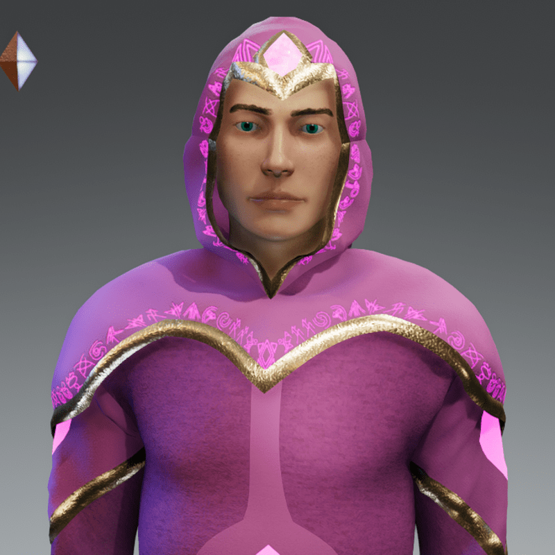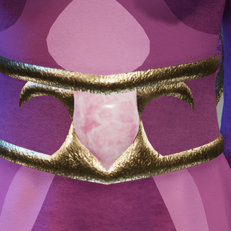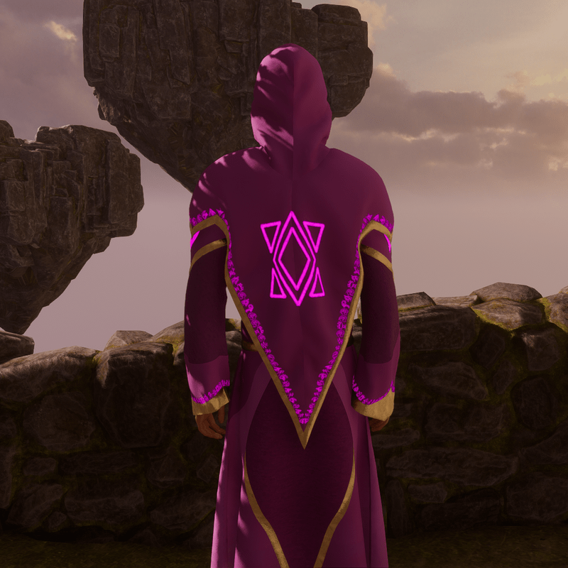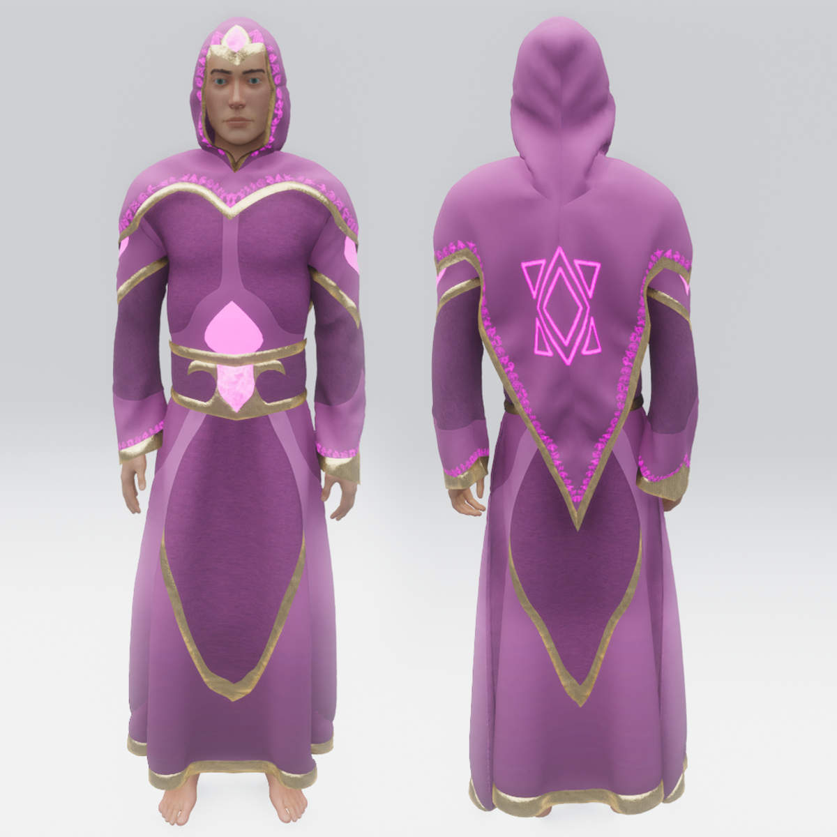 Rich Rose Quartz coloured robes with golden trims, two large glowing Rose Quartz gems set in the hood and belt. To top it all off, patiently crafted original runic alphabet lining the hood and sleeves that is luminous and animated with a pulse that fades in and out of visibility. The enchanted gemstones also glow in the same manner as the runes. Fitted to the default male avatar 2.0. A very magical garment perfect for any aspiring wizard or mage, can be used for role-play or just as a fancy outfit for a party.