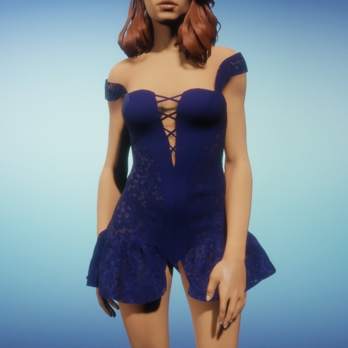 Front laced leather corset with lace panels and skirt. The embroidered lace is applied to a netting with transparency. Be sure to enable animate cloth when wearing this garment. The sleeves can easily be worn on top of the shoulders or tugged to fall gracefully onto the upper arm.