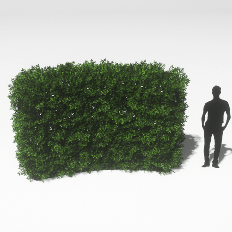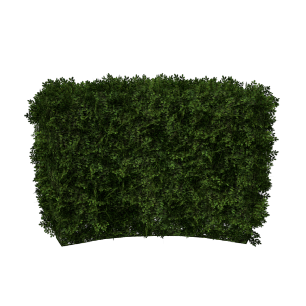A curved English Boxwood hedge section with deep green leaves. Opacity mapped textures are used for base and leaves. Approximately 4m wide, 1m deep and 3m tall. 3228 triangles.