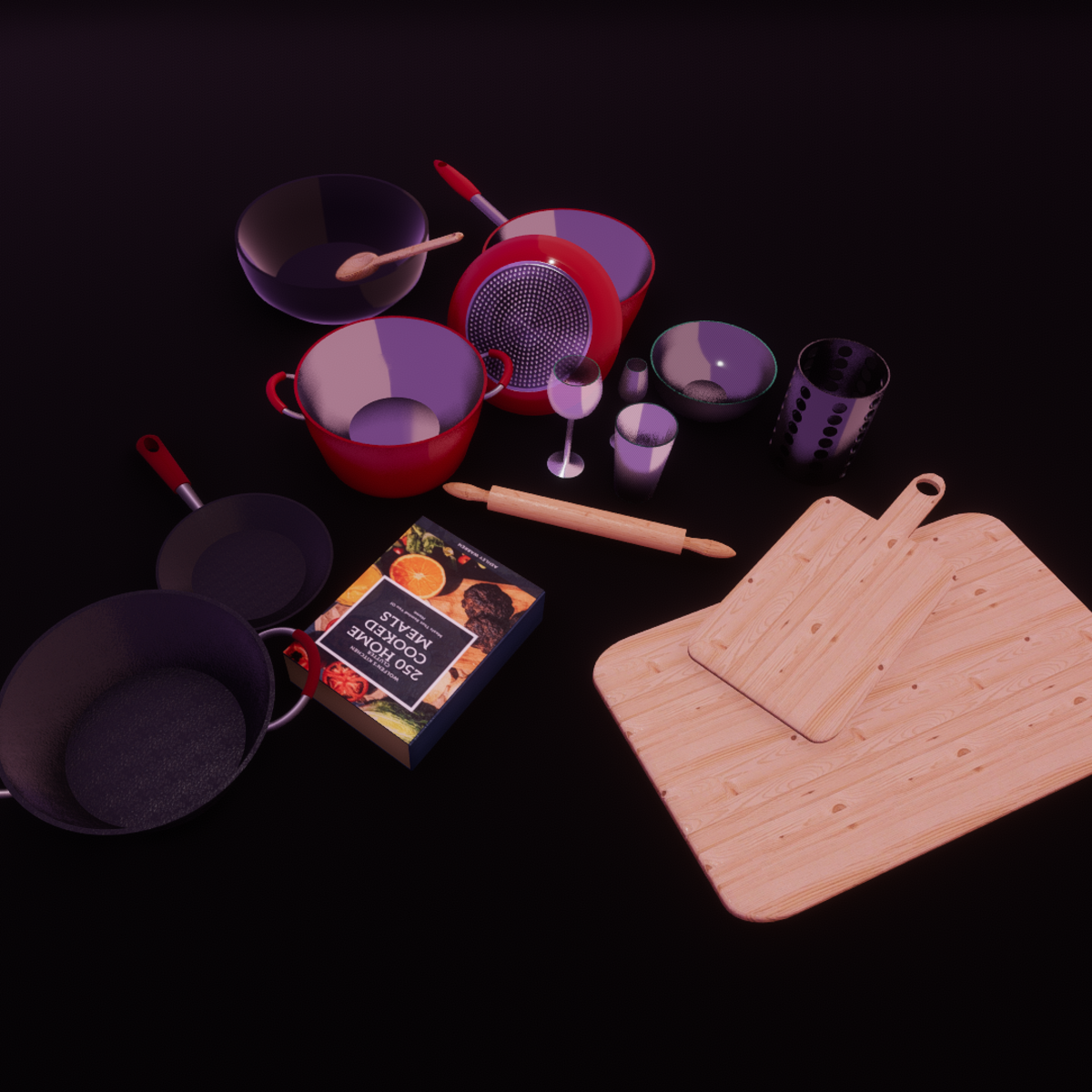 A big pack of kitchen clutter items. High quality items. All items are separate so you can move and resize and recolour all you want! Normals and collison included. Enjoy. -2 Mixing bowls -5 Pans -1 Wine Glass -1 Champagne Glass -1 Glass Cup -1 Rolling Pin -2 Cutting Boards -1 Cook Book -1 Mixing Spoon -1 Utensil Holder