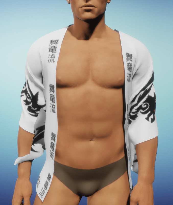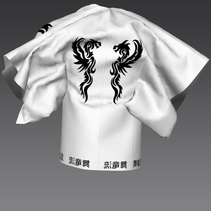 A kimono jacket using the traditional pattern. It has dragons on the sleeve and back. It is edged with kanji representing the Dancing Dragon style of kenjutsu.
