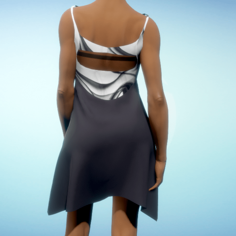 Mod-style dress featuring a swirl print on the bodice with a cut-out in back. By Sweet Distractions