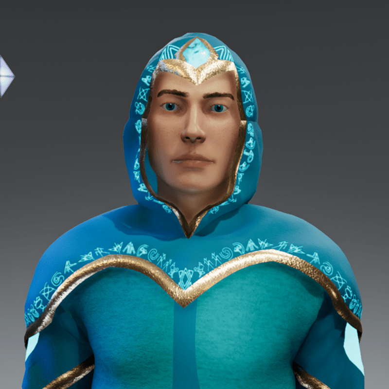 Rich turquoise coloured robes with golden trims, two large glowing turquoise gems set in the hood and belt. To top it all off, patiently crafted original runic alphabet lining the hood and sleeves that is luminous and animated with a pulse that fades in and out of visibility. The enchanted gemstones also glow in the same manner as the runes. Fitted to the default male avatar 2.0. A very magical garment perfect for any aspiring wizard or mage, can be used for role-play or just as a fancy outfit for a party.