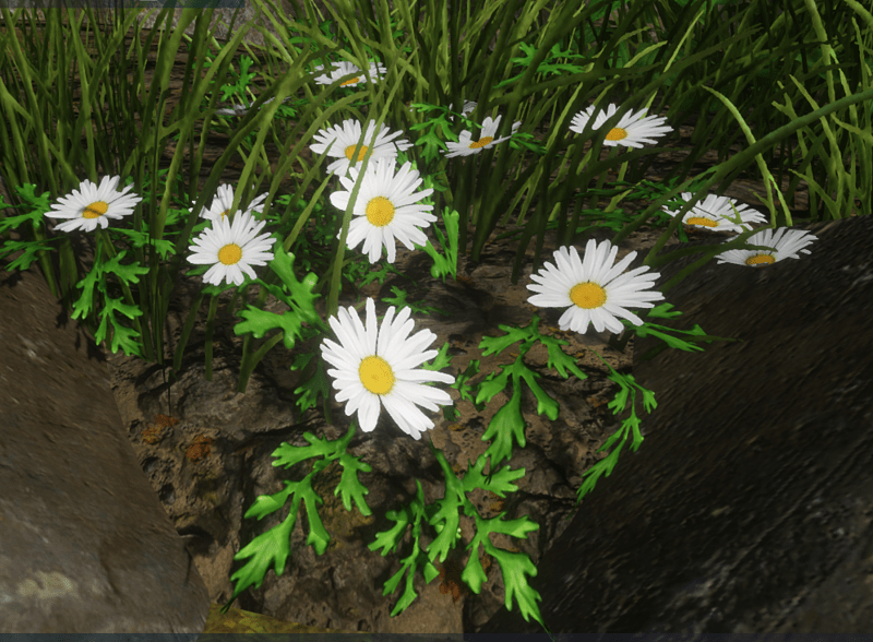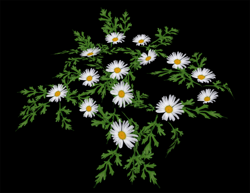 White Daisies and leaves. No stems. This is a very simplified model. It looks good on a dark background, on soil and rocks. Arrange on an angle for better effect. See images. Poly Count 1082
