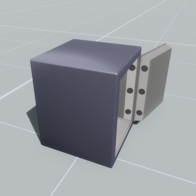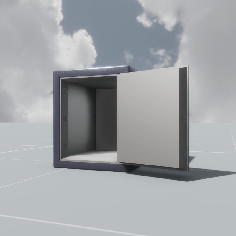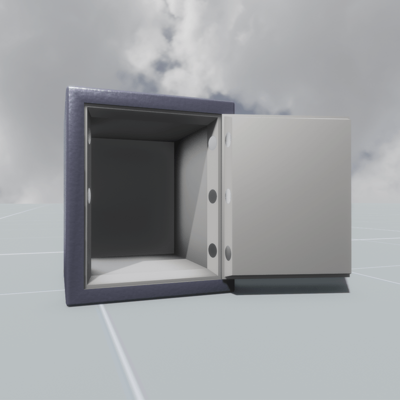 Steel safe in the dimensions 0.50 x 0.50 x 0.60 meters, exterior painted. It has also a collision mesh that is insofar detailed that it makes it possible to place other parts inside it. To use the safe in order to place items inside, a script can be added so that the included open-close animation is performed when the safe is interacted with! A script for interaction to open-close it can be found at: https://store.sansar.com/listings/04f5fc2d-ed30-4482-b804-d122637c7443/interaction-open-close If you apply the script on the safe, you will be able to place objects inside it interactively and close it to hide / store the objects inside the safe (as long as the experience is not reset). You can also use the safe without interactivity and without the script, but you will have to remove the animation component from the safe or deactivate it.