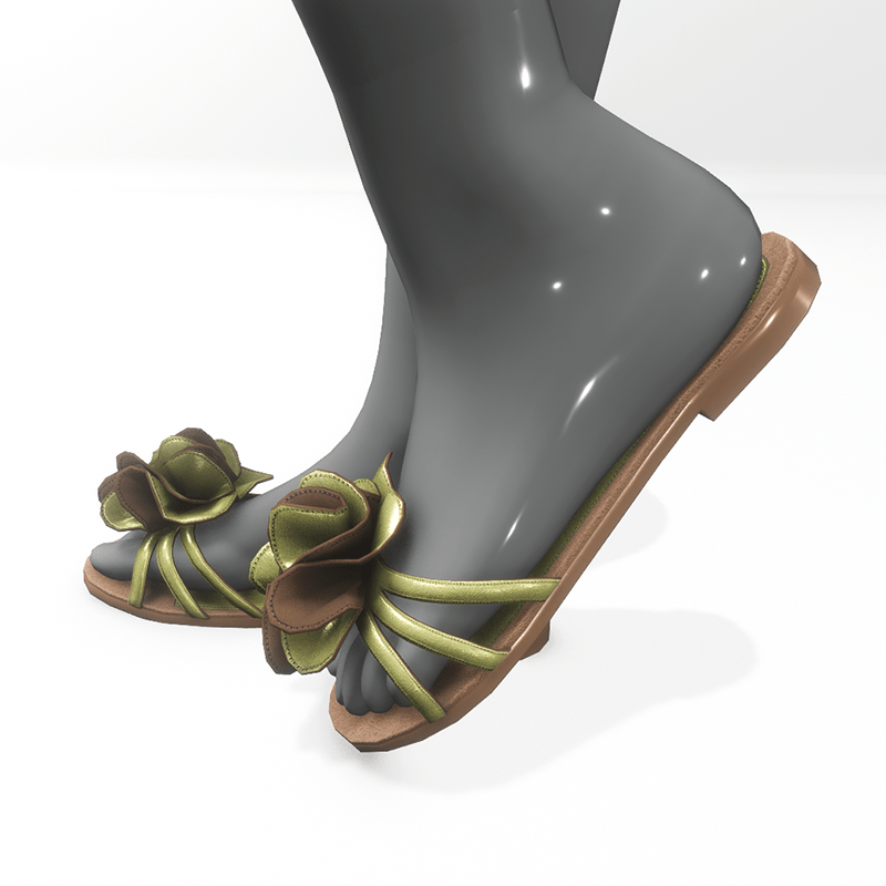 Flat summer shoes for avatar alina. They are made of brown and yellow leather and are decorated with a large flower. Sandals suitable for the city and the beach, match jeans, light dresses and shorts. Get the free demo before purchasing here: https://store.sansar.com/listings/3369fe4f-642a-4551-9501-699016c21807/flower-sandals-for-alina---demo