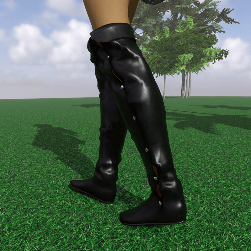 Flat, black leather pirate boots with a length just above the knee. They fasten at the side with metal buttons. They are part of the pirate costume, as shown in the photos. They fit the avatar II