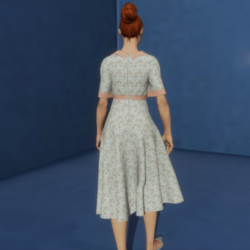 Retro 1930's style dress with very full bias skirt, elbow length sleeves, empire waistline, and pointed flat collar. Fabric is a tightly woven cotton in a tiny floral print with solid accents at waist, collar, and sleeve cuffs. A zipper at the back finishes off the dress. Please use simulate cloth in lookbook when wearing this dress. ***** Please note that due to the longer length skirt and the fullness of the skirt some distorting of the print occurs at times when the skirt stretches; however, the print is so tiny while it does distort it's not overly noticeable. Due to this distortion, I'm placing the dress as a free item.