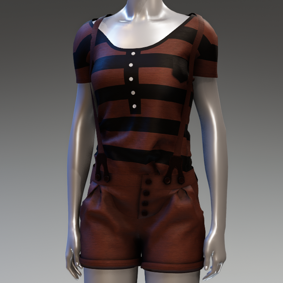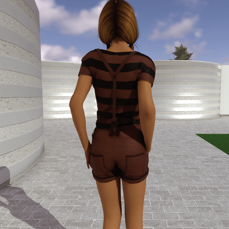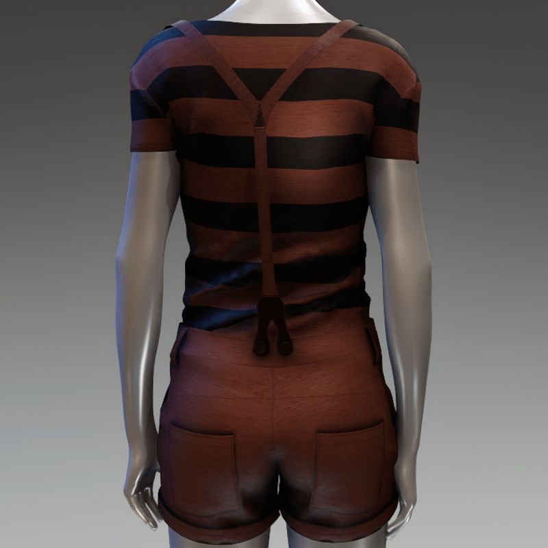 A very cute casual set in black and warm brown colour. The t shirt has short sleeves and horizontal stripes. The short has matching suspenders, pockets at the sides and back and small pleats at the front.
