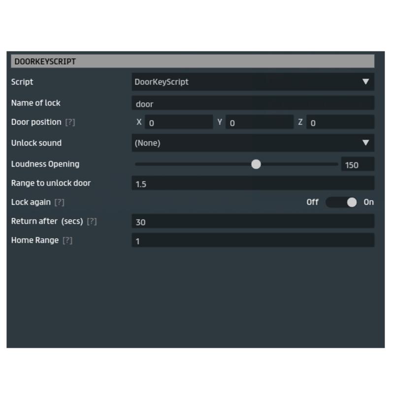 This script permits to UNLOCK my locked door (check the store for my scripted doors, tag "easydoors"). Simply insert name of door, coordinates of door to unlock and a range of action. You can optionally add an unlock sound. Key will return to home position after a certain time that you set. I use this script in my experiences. ★ If you like this item, please support me giving a rate! www.sergiodelacruz.net