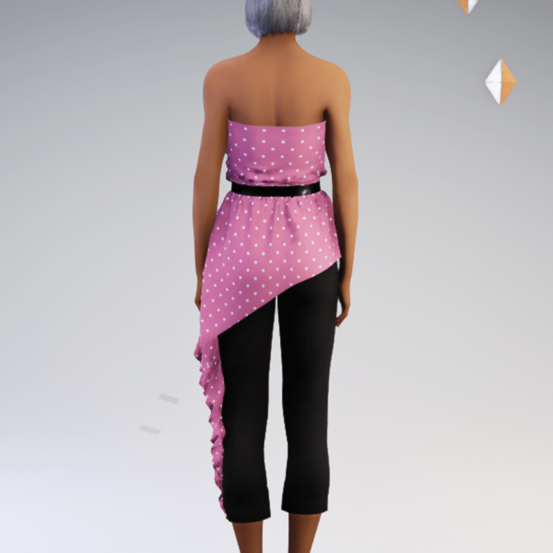 Belted strapless asymmetric blouse and capri pant outfit featuring a polkadot print. by Sweet Distractions