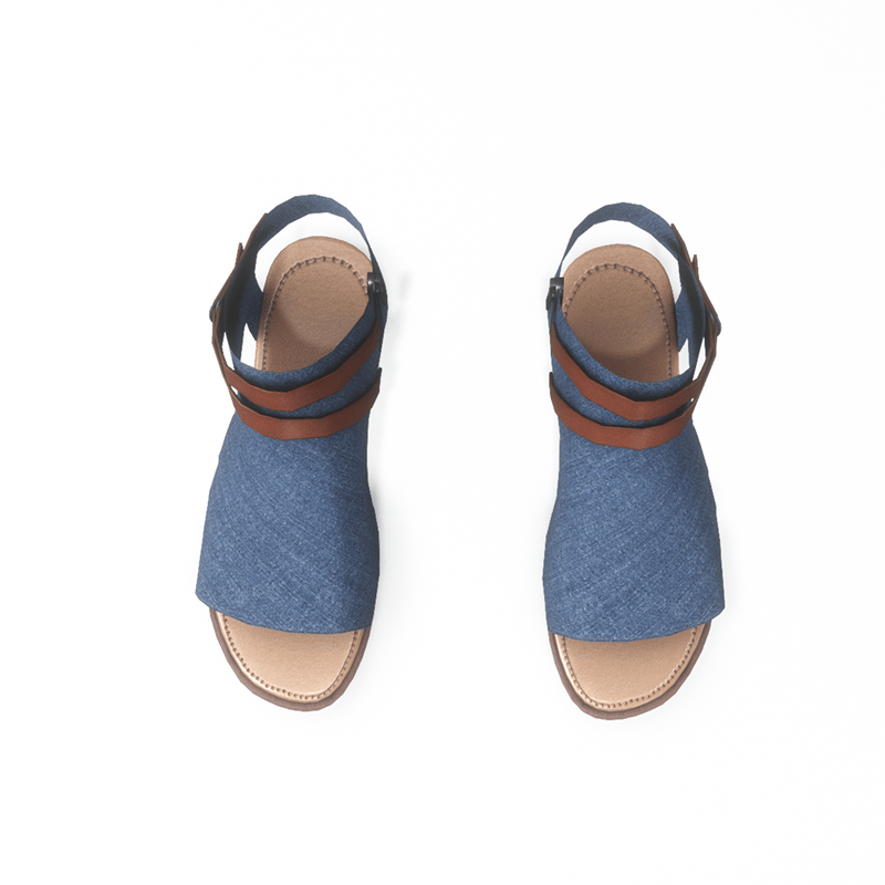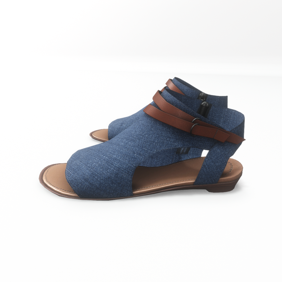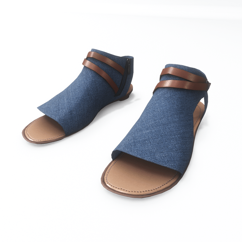 A modern pair of flat sandals made with blue denim fabric. The shoes have an inside zipper closure and decorative leather straps around the ankle. Get the free demo to check style and fitness before purchasing here: https://store.sansar.com/listings/068ce114-0610-4487-8dcf-405b6ba01511/av-20---open-toe-textile-sandals---demo
