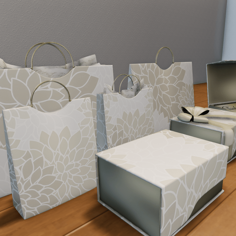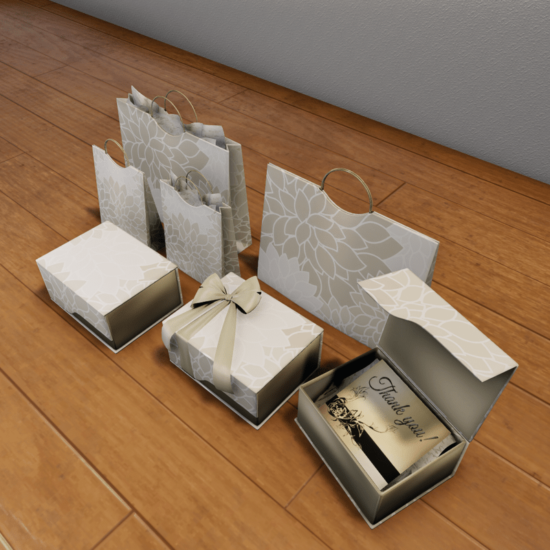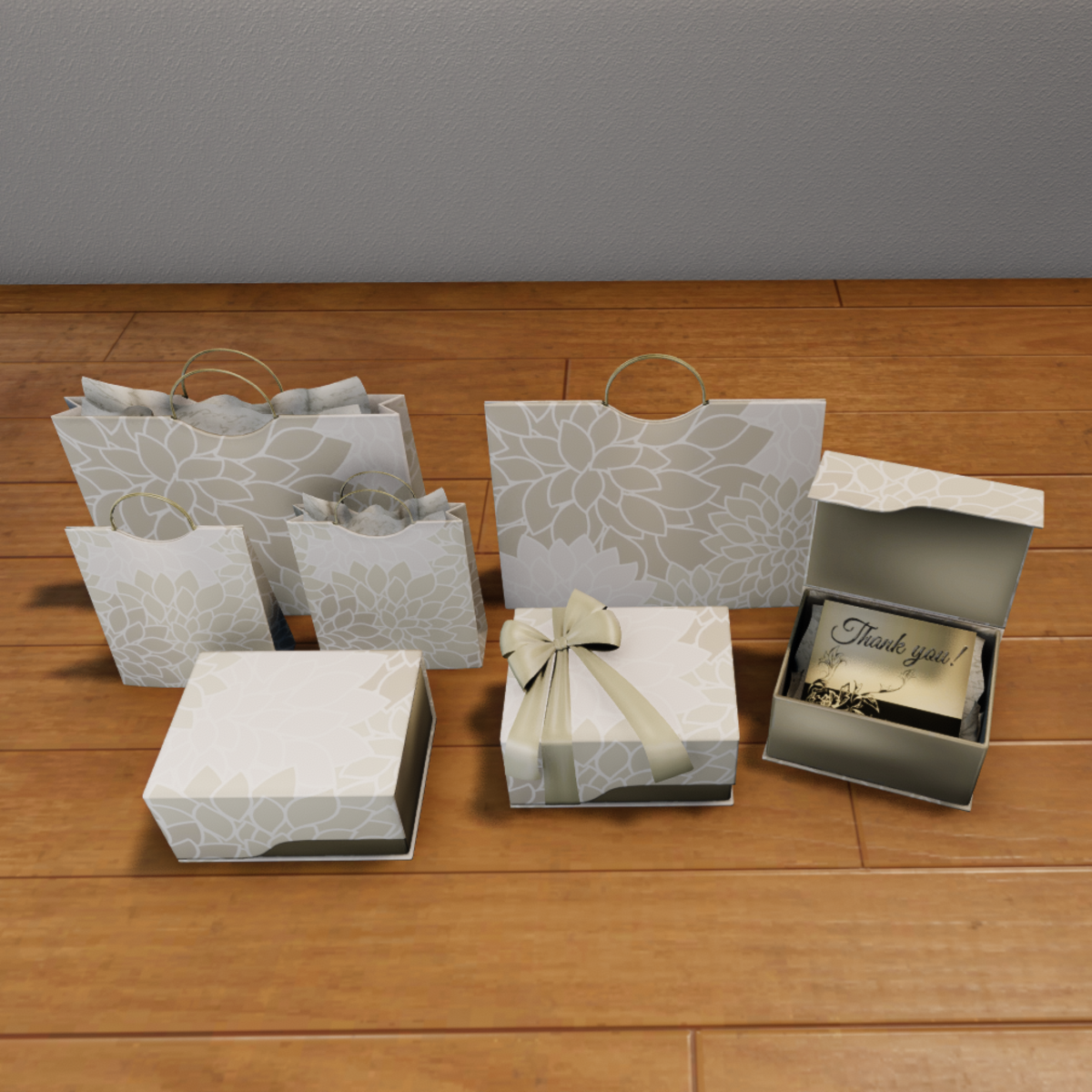 Complete set of seven carrier bags and boxes worthy of a luxury boutique. Features: - 2 opened bags (one tall and one wide) - 2 closed bags (one tall and one wide) - 1 box with card - 1 solid box - 1 lid with ribbon