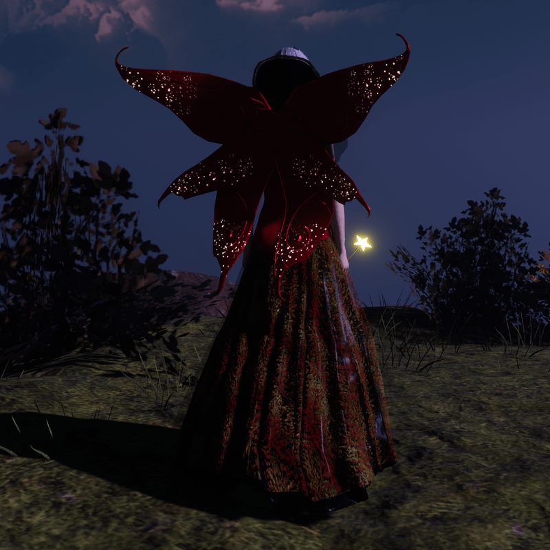 Red fairy wings for fairy God mother costume. can be seen in world follow link here https://atlas.sansar.com/experiences/eleganceceleste-1611/elegance-celeste-new-store Hat can be found at this link also. Making your virtual world real