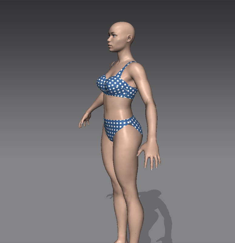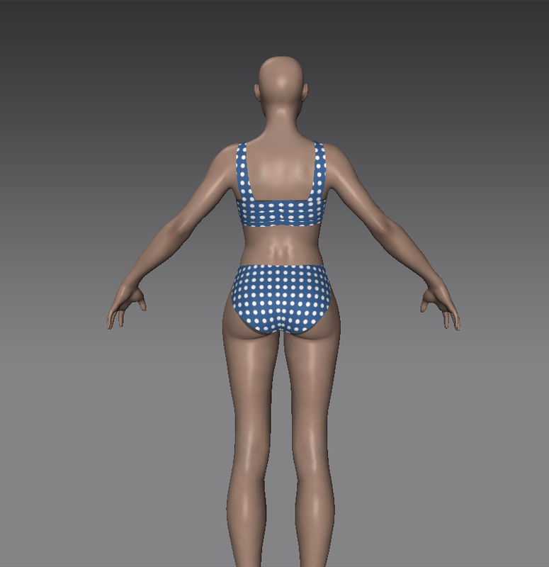 A two-piece women's bikini, cut in the more modest early-1960's style, featuring and blue-and-white polka-dot pattern. Go retro at the beach!