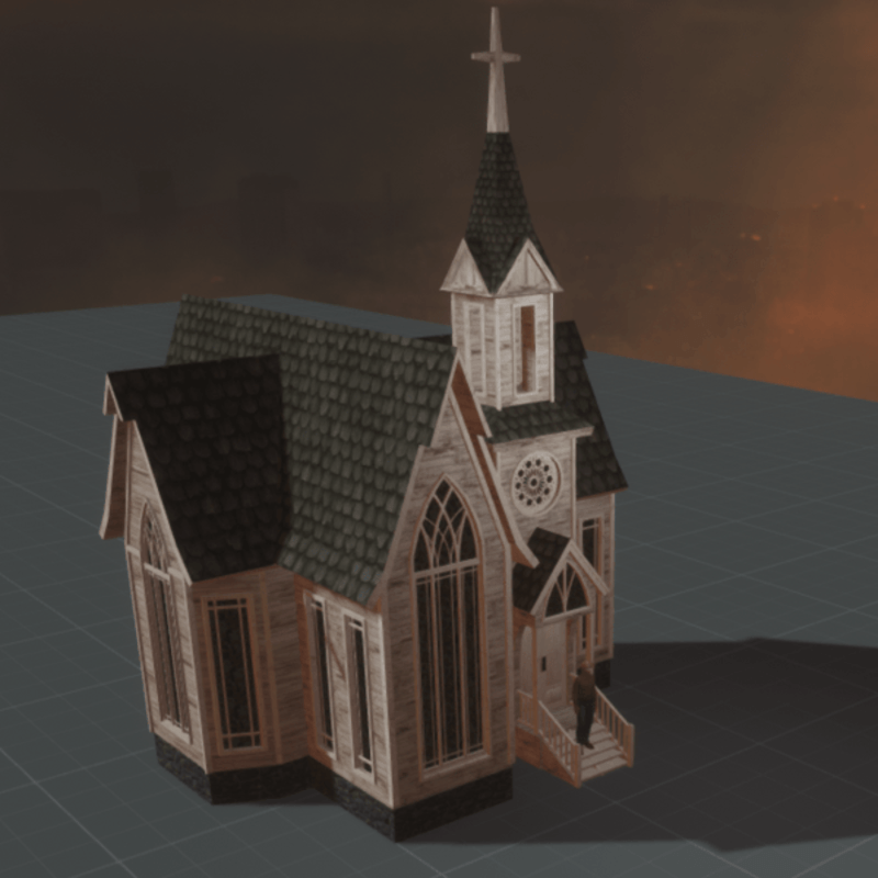 Small decorative non-enterable weathered chapel with emissive dark glass windows...