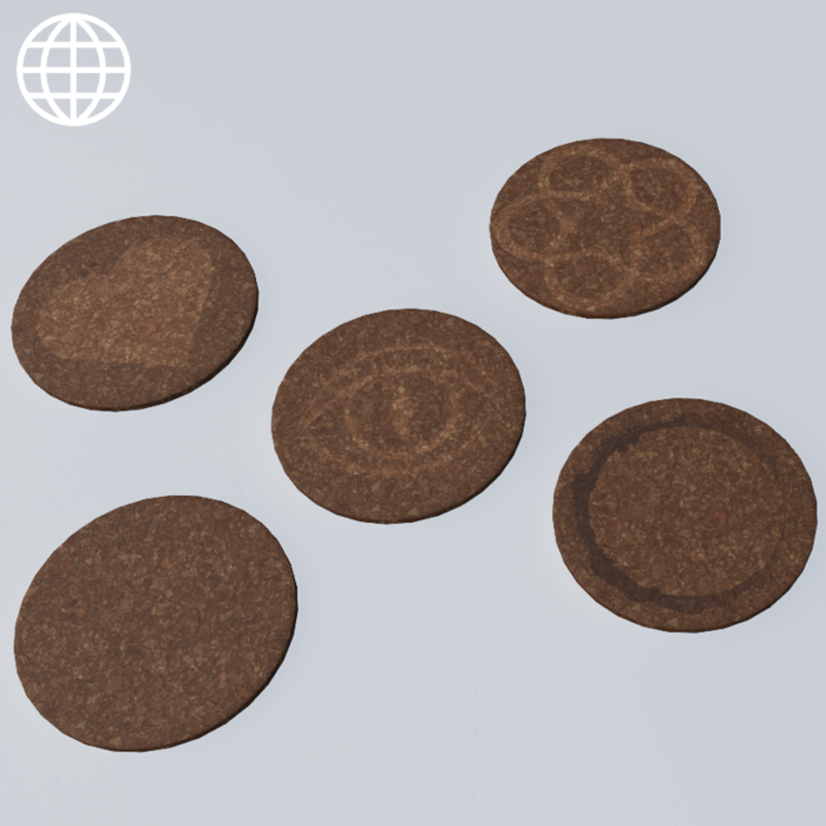 Cork Coasters 5 pack, duplicate the desired design as much as you need. Contact "TheNick-1981" through Sansar or Sansar discord if you need re-rigging, a custom design or if there is a problem etc.