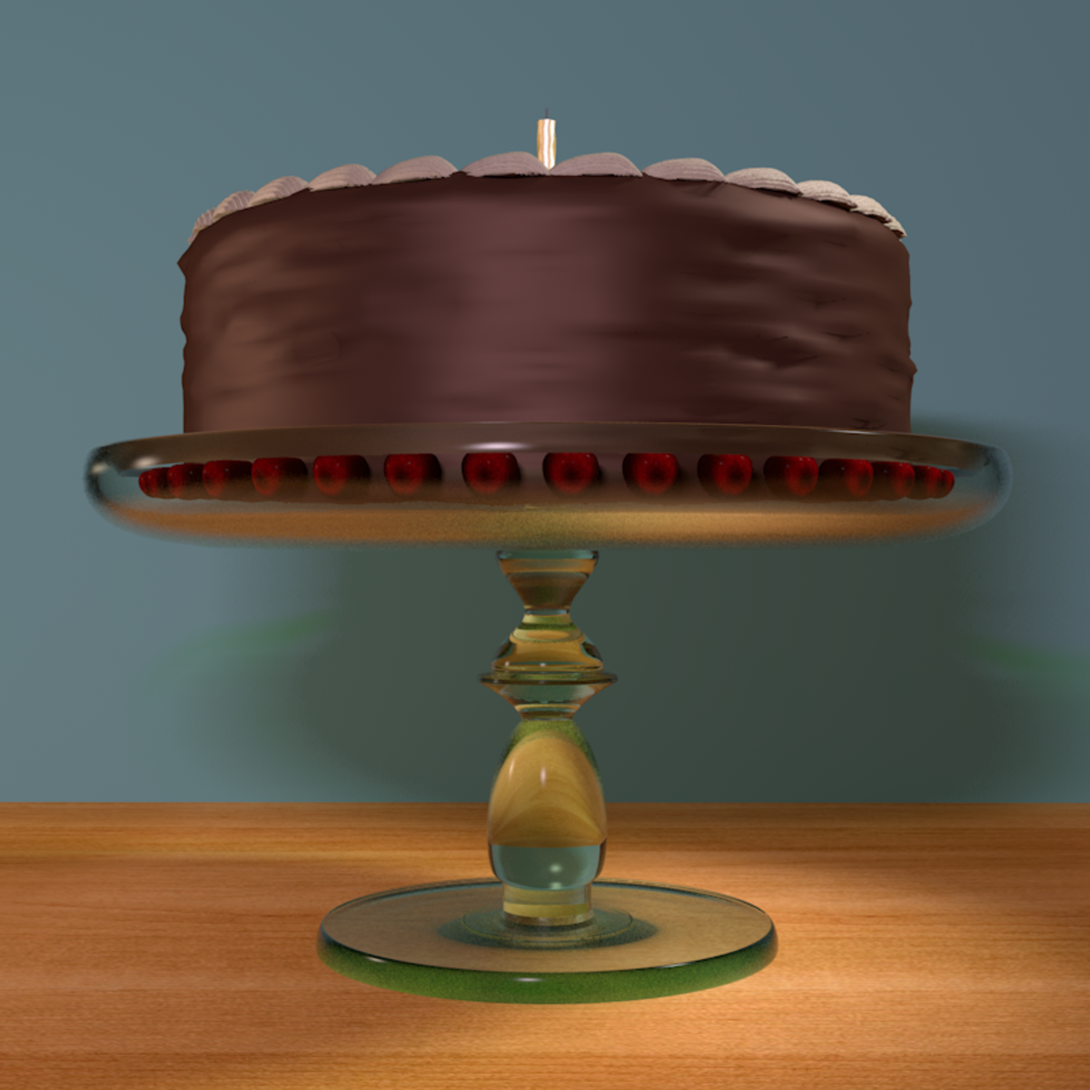 A delicious chocolate birthday cake with chocolate frosting, a trim of caramel frosting coquilles and a ring of dark cherries, on an elegant green glass stand. A yellow birthday candle is ready for you to light. Yum!