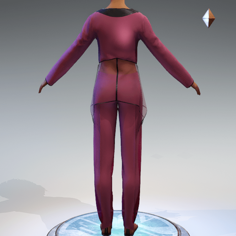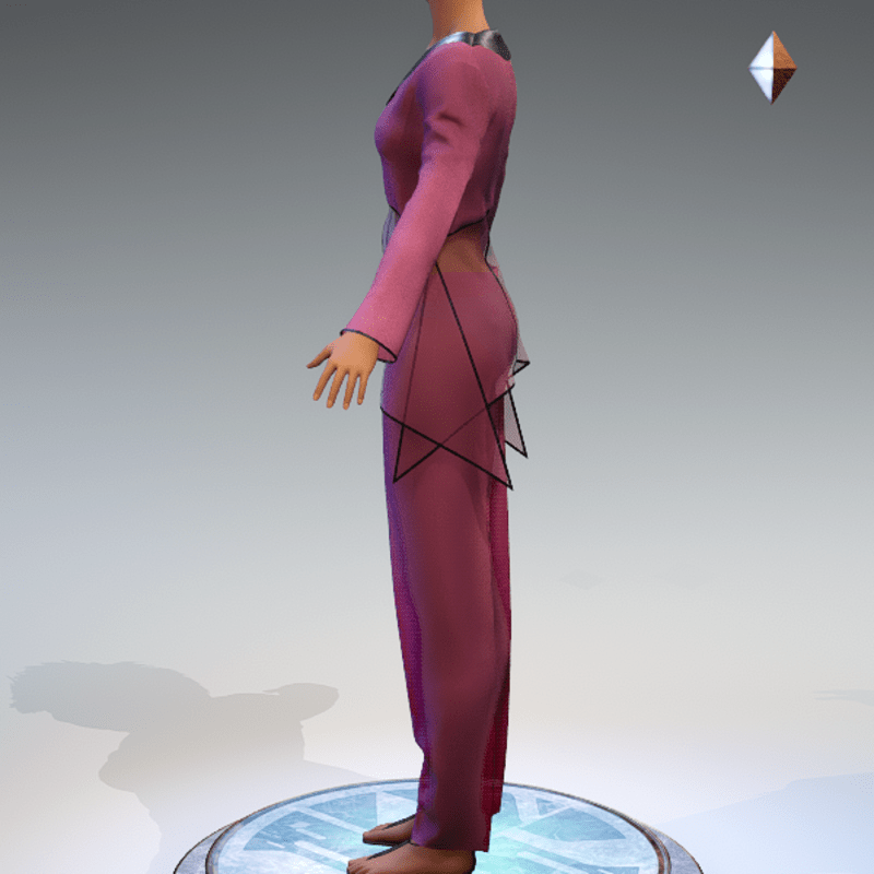 Elegant pant suit with a tunic-style blazer. The blazer features sheer panels and crocodile leather detailing and collar. By Sweet Distractions